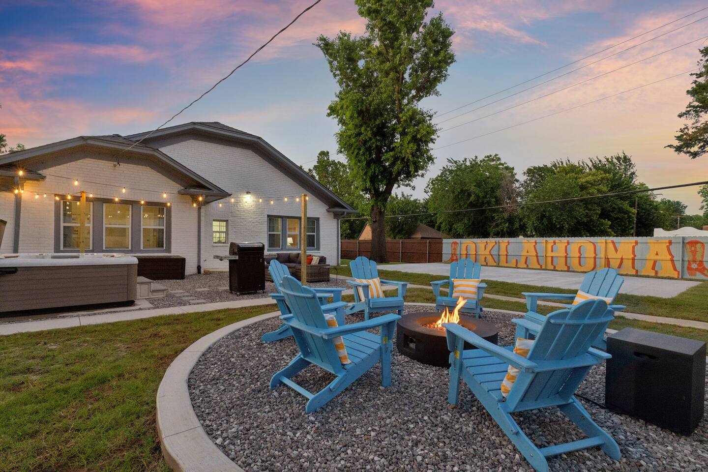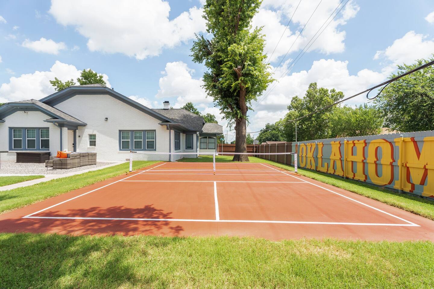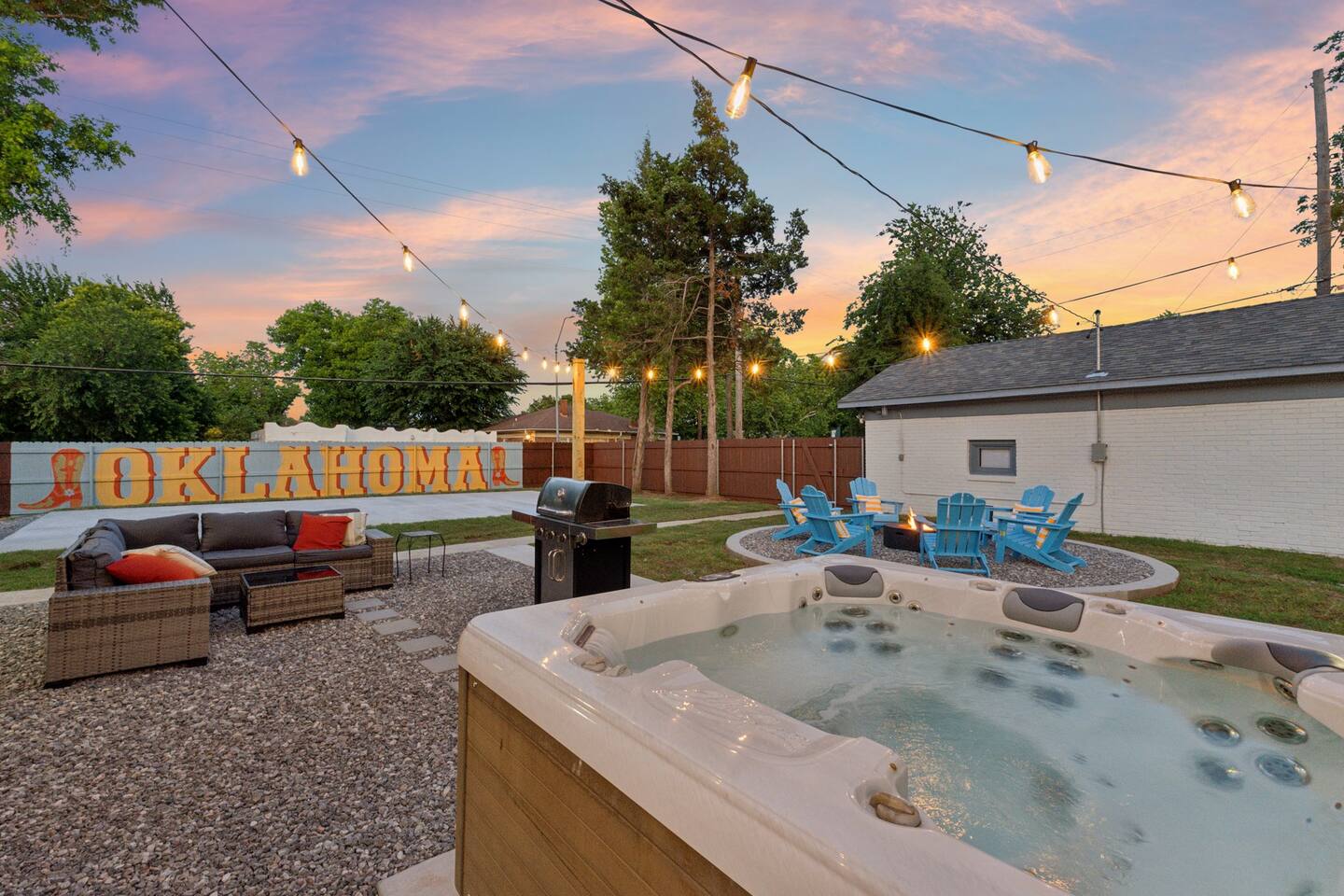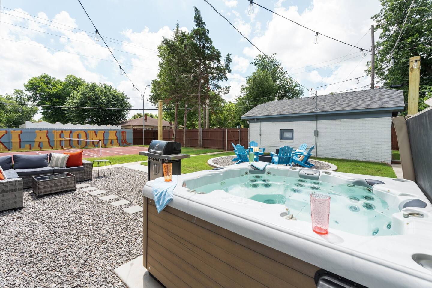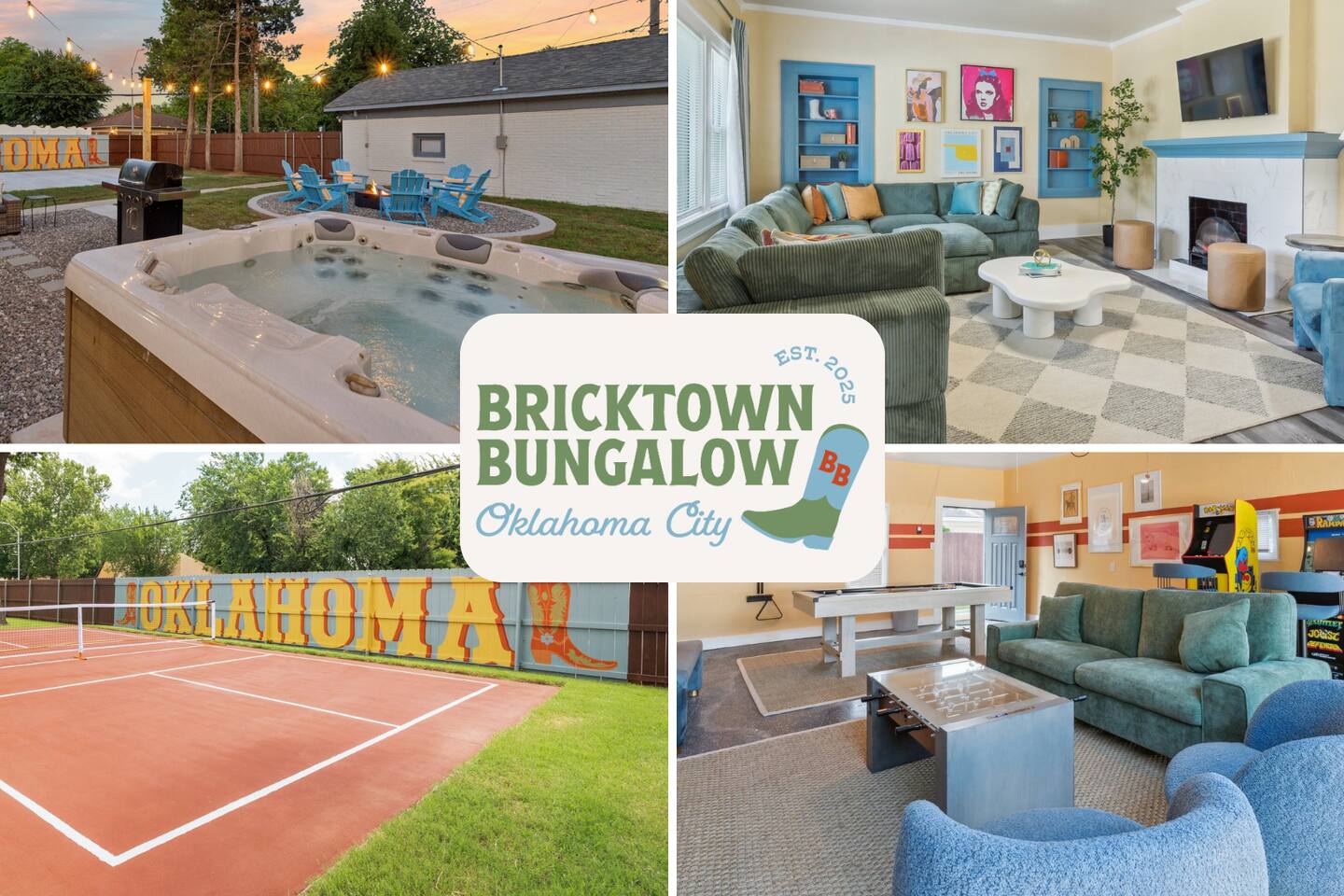 Centrally located in Oklahoma City so that it's close to just about anything you want to do! - OKC Fairgrounds - 8 minutes (Horse Shows, Fairs) - Paycom Center - 11 minutes (OKC Thunder, Concerts) - Myriad Botanical Garden - 10 minutes - State Capitol - 11 minutes - Bricktown District - 13 minutes - Riversport (Boathouse District) - 15 minutes - OKC National Memorial and Museum -9 minutes - National Cowboy & Western Heritage Museum - 11 minutes - Frontier City - 15 minutes - Science Museum OKC - 13 minutes - Scissortail Park - 11 minutes - OKC Zoo - 15 minutes - Lake Hefner - 13 minutes This property, Bricktown Bungalow, was designed with all ages and interests in mind! It's a destination in and of itself! --------------- Backyard amenities - fully fenced, spacious backyard with hot tub (and hot tub towels), firepit, corn hole, seating area, mural for a photo op, grill and a private pickleball court! Gameroom - a separate gaming space with billiards, foosball, arcade games and a 50" Roku TV. Don't forget a picture with our neon sign! Living Room - large sectional, chair and ottomans for seating, 50" Roku TV, electric fireplace, ceiling fan. Check the friendly robot for games! Dining Room - large table with seating for 8 (additional seating in the kitchen), buffet stocked with a Keurig, starter pods, coffee grounds, mugs and stemware Kitchen - additional table and seating, granite counters, gas range, oven, microwave, dishwasher, large fridge with ice maker. Slow cooker, Instant Pot, blender, toaster, utensils, baking pans, pots, skillets, knives, kids plates and cups, towels, stemware, and more! (Booster seat available.) Master Bedroom - gorgeously designed, comfy room with king bed, 50" Roku TV, celing fan, dresser, lamps, full length mirror, blackout curtains, alarm clock, sound machine, iron/board, closet with hangers. This room also has a designated work space with small desk. Master Bathroom - large shower, new vanity with granite counter top, hair dryer. We provide hand soap, some toilet paper and all towels! Bedroom 2 - a vibrant, luxe room with two queen beds. Enjoy a 50" Roku TV, blackout curtains, alarm clock, sound machine, closet with hangers, full length mirror, dresser, nightstand, lamp, and benches. Bedroom 3 - this bedroom, with two queen beds, also comes with a 50" Roku TV, blackout curtains, alarm clock, sound machine, closet with hangers, full length mirror, dresser, nightstand with charger, lamp, and benches. For any children in your group, this is where they will find some fun toys like stick ponies and books! Hallway Bathroom - located directly between bedroom 2 and 3 for easy access! Large mirror and granite top vanity, tub/shower combo and storage for toiletries. We provide towels, hair dryer, some toilet paper and hand soap. A full size washer and dryer are available for your use in the basement.