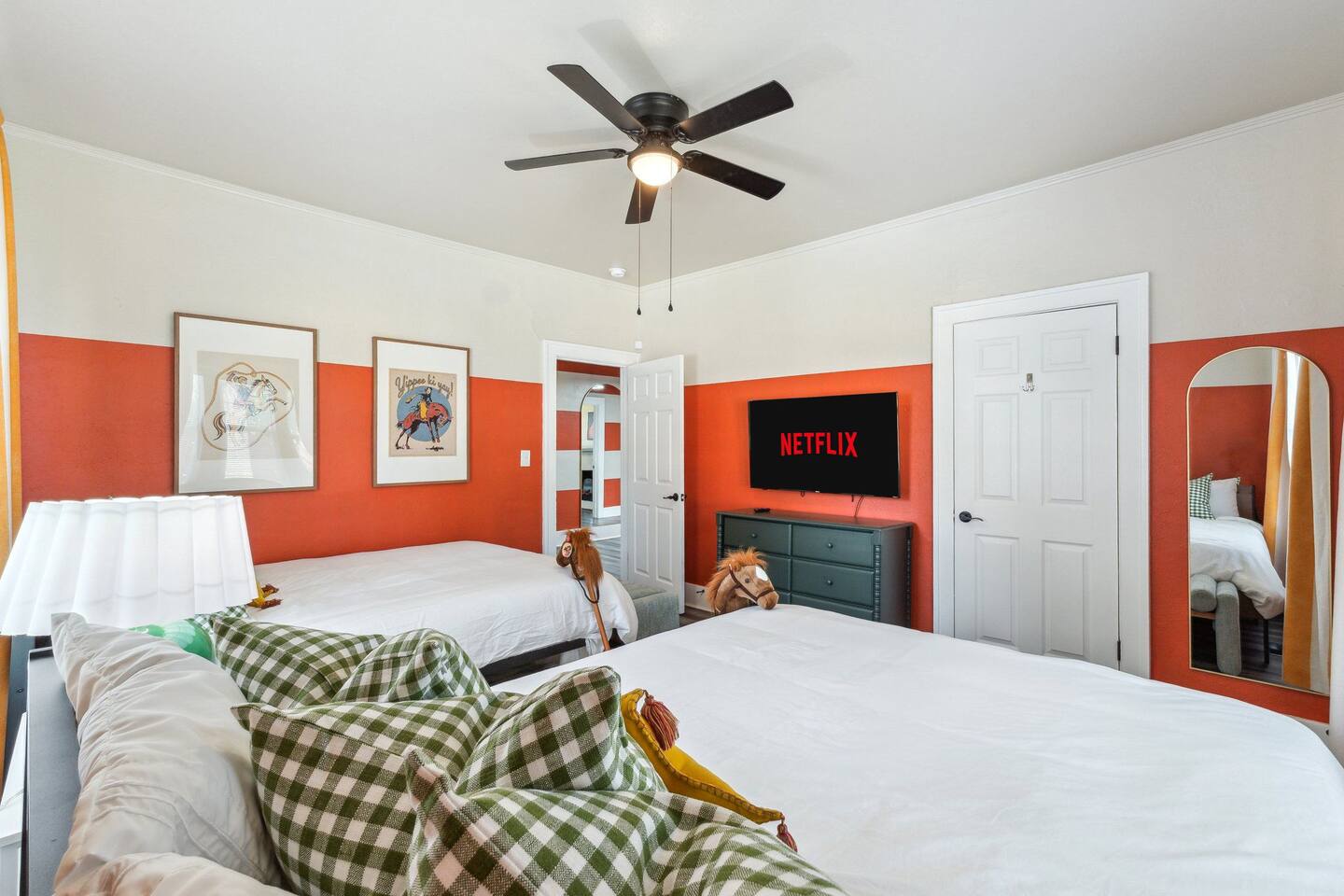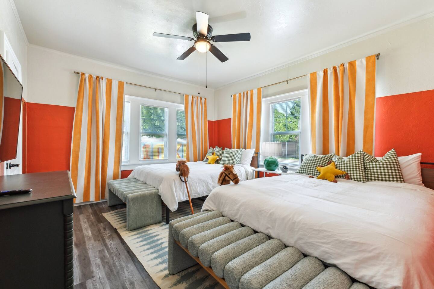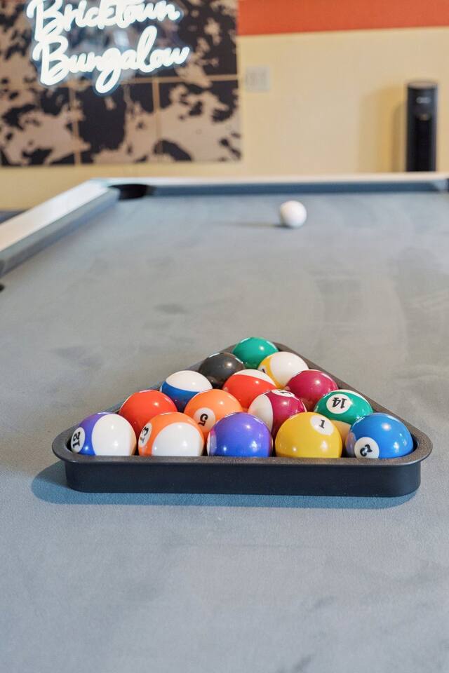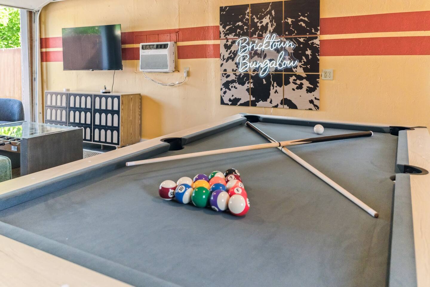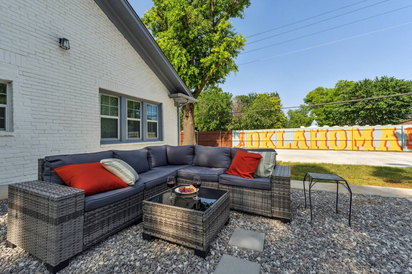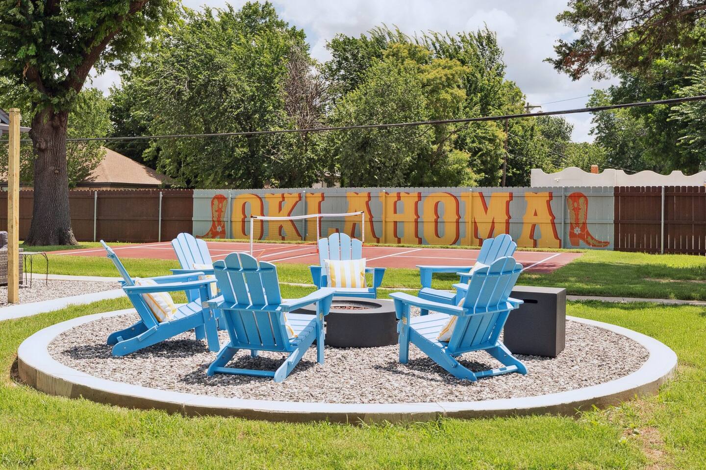 Centrally located in Oklahoma City so that it's close to just about anything you want to do! - OKC Fairgrounds - 8 minutes (Horse Shows, Fairs) - Paycom Center - 11 minutes (OKC Thunder, Concerts) - Myriad Botanical Garden - 10 minutes - State Capitol - 11 minutes - Bricktown District - 13 minutes - Riversport (Boathouse District) - 15 minutes - OKC National Memorial and Museum -9 minutes - National Cowboy & Western Heritage Museum - 11 minutes - Frontier City - 15 minutes - Science Museum OKC - 13 minutes - Scissortail Park - 11 minutes - OKC Zoo - 15 minutes - Lake Hefner - 13 minutes This property, Bricktown Bungalow, was designed with all ages and interests in mind! It's a destination in and of itself! --------------- Backyard amenities - fully fenced, spacious backyard with hot tub (and hot tub towels), firepit, corn hole, seating area, mural for a photo op, grill and a private pickleball court! Gameroom - a separate gaming space with billiards, foosball, arcade games and a 50" Roku TV. Don't forget a picture with our neon sign! Living Room - large sectional, chair and ottomans for seating, 50" Roku TV, electric fireplace, ceiling fan. Check the friendly robot for games! Dining Room - large table with seating for 8 (additional seating in the kitchen), buffet stocked with a Keurig, starter pods, coffee grounds, mugs and stemware Kitchen - additional table and seating, granite counters, gas range, oven, microwave, dishwasher, large fridge with ice maker. Slow cooker, Instant Pot, blender, toaster, utensils, baking pans, pots, skillets, knives, kids plates and cups, towels, stemware, and more! (Booster seat available.) Master Bedroom - gorgeously designed, comfy room with king bed, 50" Roku TV, celing fan, dresser, lamps, full length mirror, blackout curtains, alarm clock, sound machine, iron/board, closet with hangers. This room also has a designated work space with small desk. Master Bathroom - large shower, new vanity with granite counter top, hair dryer. We provide hand soap, some toilet paper and all towels! Bedroom 2 - a vibrant, luxe room with two queen beds. Enjoy a 50" Roku TV, blackout curtains, alarm clock, sound machine, closet with hangers, full length mirror, dresser, nightstand, lamp, and benches. Bedroom 3 - this bedroom, with two queen beds, also comes with a 50" Roku TV, blackout curtains, alarm clock, sound machine, closet with hangers, full length mirror, dresser, nightstand with charger, lamp, and benches. For any children in your group, this is where they will find some fun toys like stick ponies and books! Hallway Bathroom - located directly between bedroom 2 and 3 for easy access! Large mirror and granite top vanity, tub/shower combo and storage for toiletries. We provide towels, hair dryer, some toilet paper and hand soap. A full size washer and dryer are available for your use in the basement.