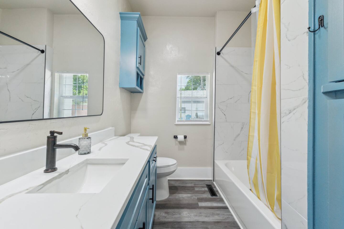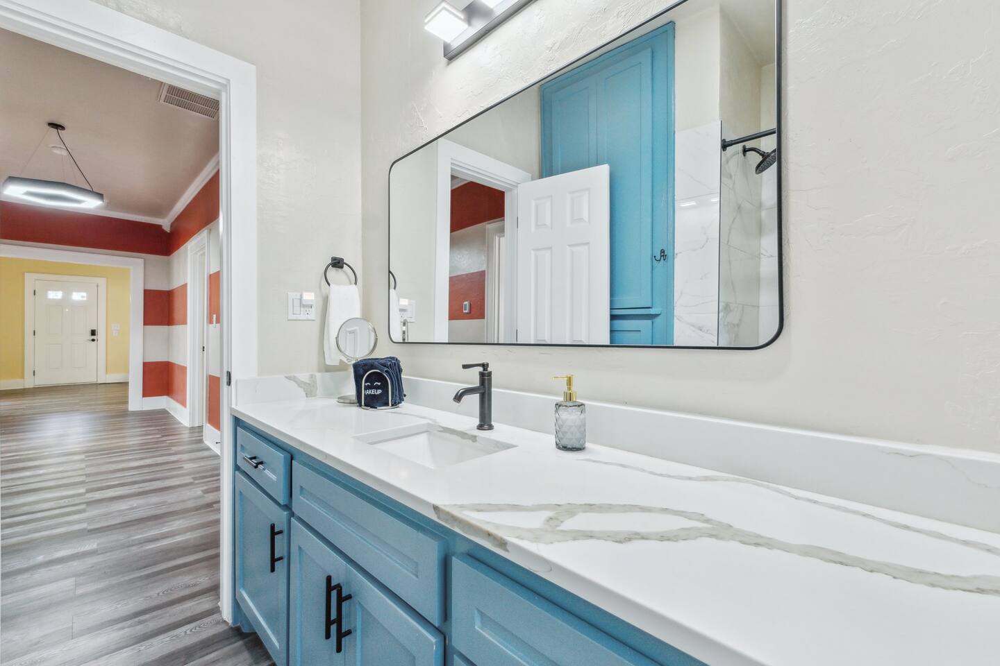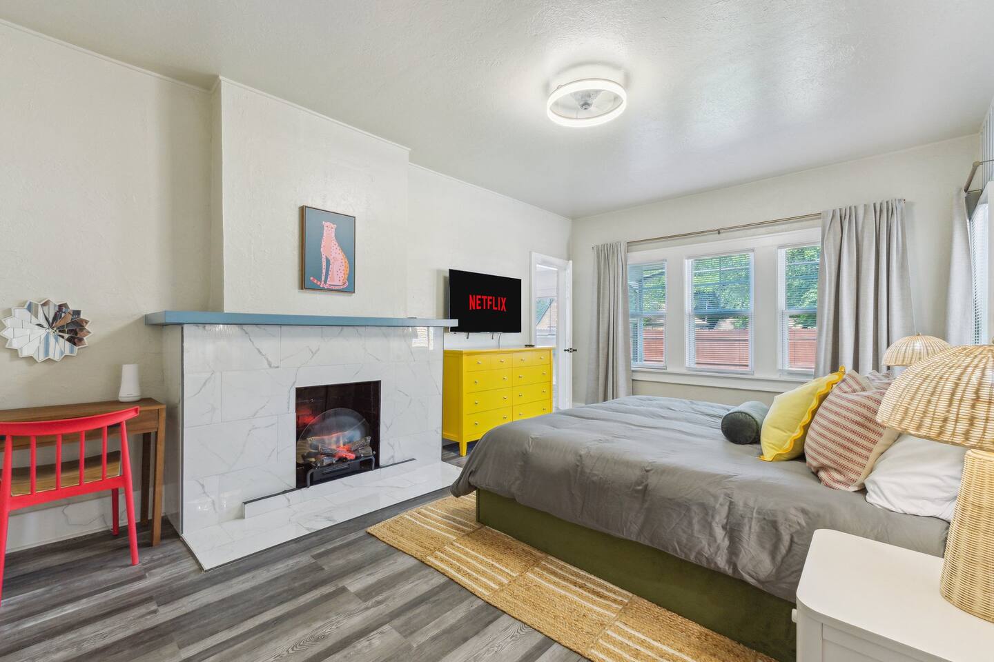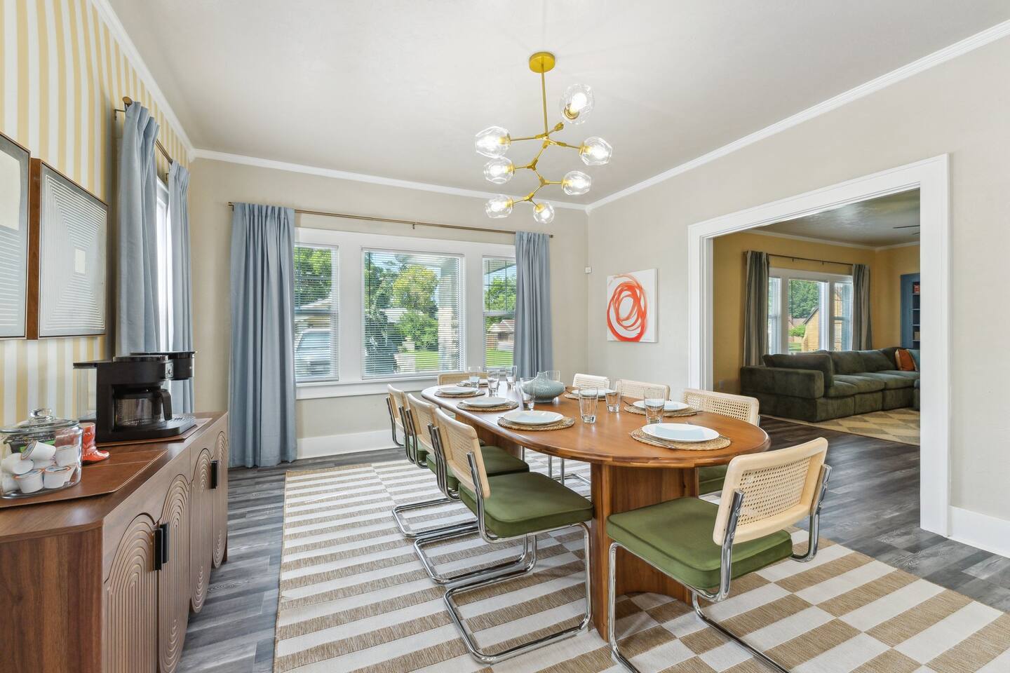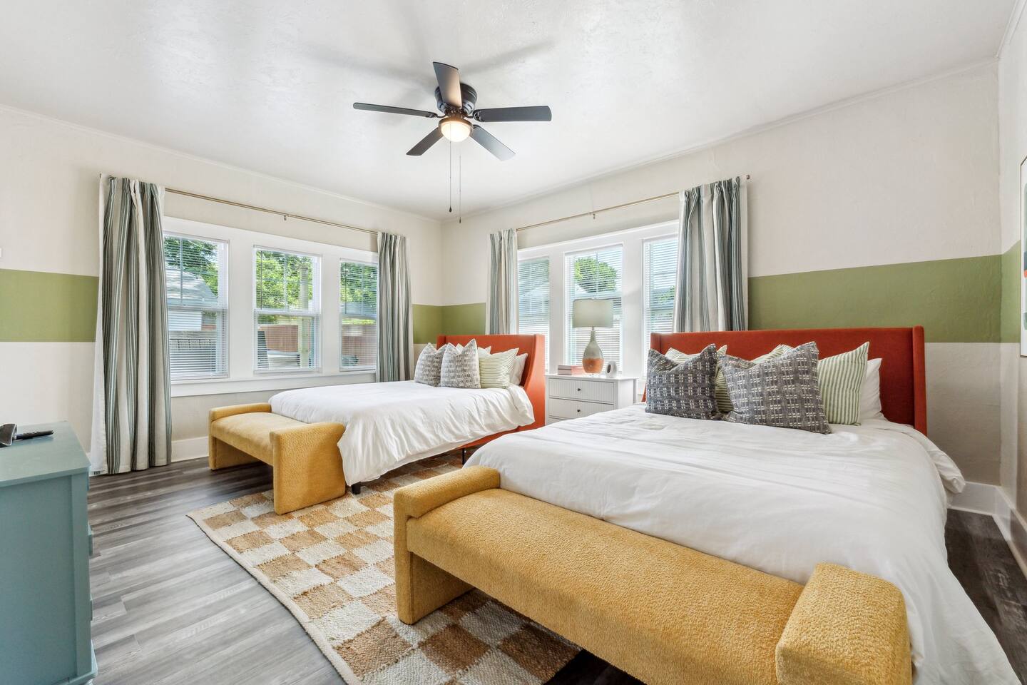 Centrally located in Oklahoma City so that it's close to just about anything you want to do! - OKC Fairgrounds - 8 minutes (Horse Shows, Fairs) - Paycom Center - 11 minutes (OKC Thunder, Concerts) - Myriad Botanical Garden - 10 minutes - State Capitol - 11 minutes - Bricktown District - 13 minutes - Riversport (Boathouse District) - 15 minutes - OKC National Memorial and Museum -9 minutes - National Cowboy & Western Heritage Museum - 11 minutes - Frontier City - 15 minutes - Science Museum OKC - 13 minutes - Scissortail Park - 11 minutes - OKC Zoo - 15 minutes - Lake Hefner - 13 minutes This property, Bricktown Bungalow, was designed with all ages and interests in mind! It's a destination in and of itself! --------------- Backyard amenities - fully fenced, spacious backyard with hot tub (and hot tub towels), firepit, corn hole, seating area, mural for a photo op, grill and a private pickleball court! Gameroom - a separate gaming space with billiards, foosball, arcade games and a 50" Roku TV. Don't forget a picture with our neon sign! Living Room - large sectional, chair and ottomans for seating, 50" Roku TV, electric fireplace, ceiling fan. Check the friendly robot for games! Dining Room - large table with seating for 8 (additional seating in the kitchen), buffet stocked with a Keurig, starter pods, coffee grounds, mugs and stemware Kitchen - additional table and seating, granite counters, gas range, oven, microwave, dishwasher, large fridge with ice maker. Slow cooker, Instant Pot, blender, toaster, utensils, baking pans, pots, skillets, knives, kids plates and cups, towels, stemware, and more! (Booster seat available.) Master Bedroom - gorgeously designed, comfy room with king bed, 50" Roku TV, celing fan, dresser, lamps, full length mirror, blackout curtains, alarm clock, sound machine, iron/board, closet with hangers. This room also has a designated work space with small desk. Master Bathroom - large shower, new vanity with granite counter top, hair dryer. We provide hand soap, some toilet paper and all towels! Bedroom 2 - a vibrant, luxe room with two queen beds. Enjoy a 50" Roku TV, blackout curtains, alarm clock, sound machine, closet with hangers, full length mirror, dresser, nightstand, lamp, and benches. Bedroom 3 - this bedroom, with two queen beds, also comes with a 50" Roku TV, blackout curtains, alarm clock, sound machine, closet with hangers, full length mirror, dresser, nightstand with charger, lamp, and benches. For any children in your group, this is where they will find some fun toys like stick ponies and books! Hallway Bathroom - located directly between bedroom 2 and 3 for easy access! Large mirror and granite top vanity, tub/shower combo and storage for toiletries. We provide towels, hair dryer, some toilet paper and hand soap. A full size washer and dryer are available for your use in the basement.