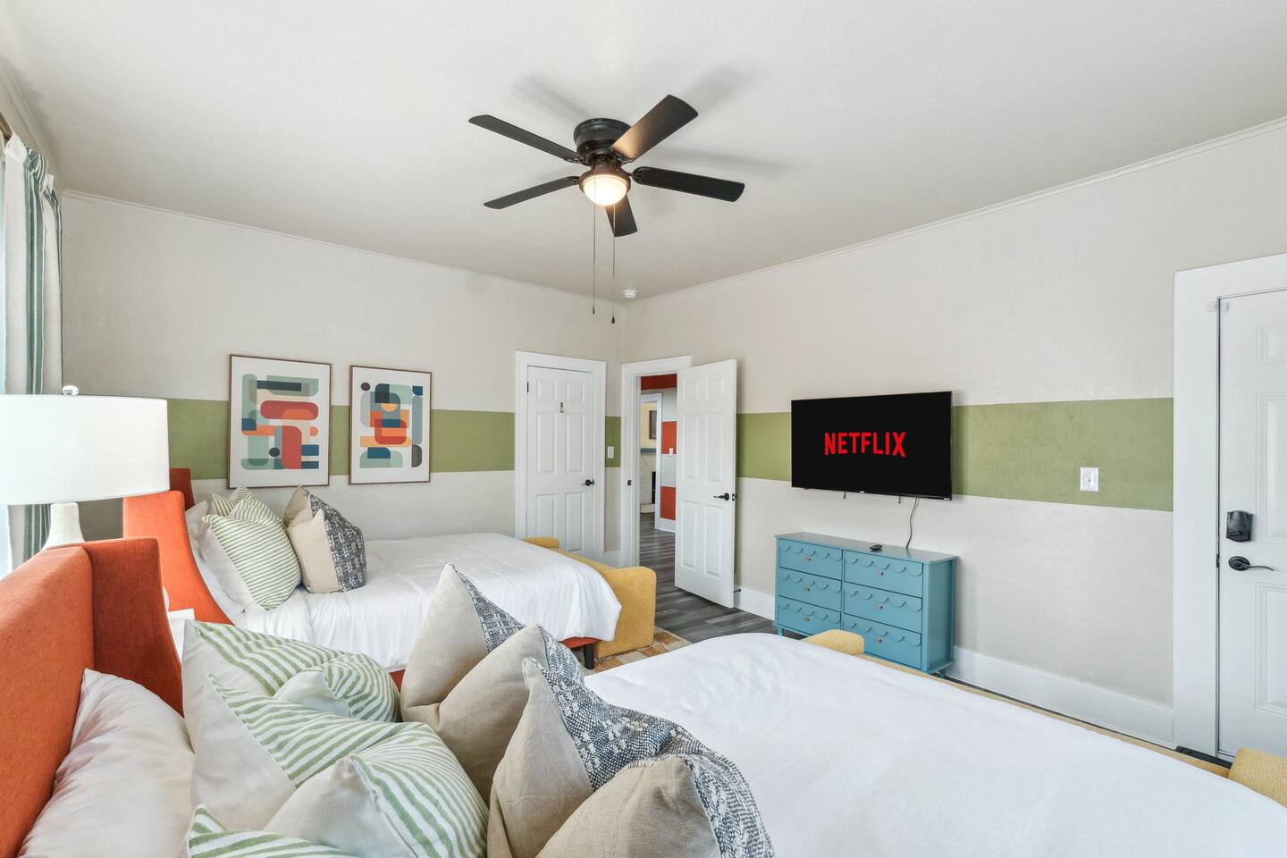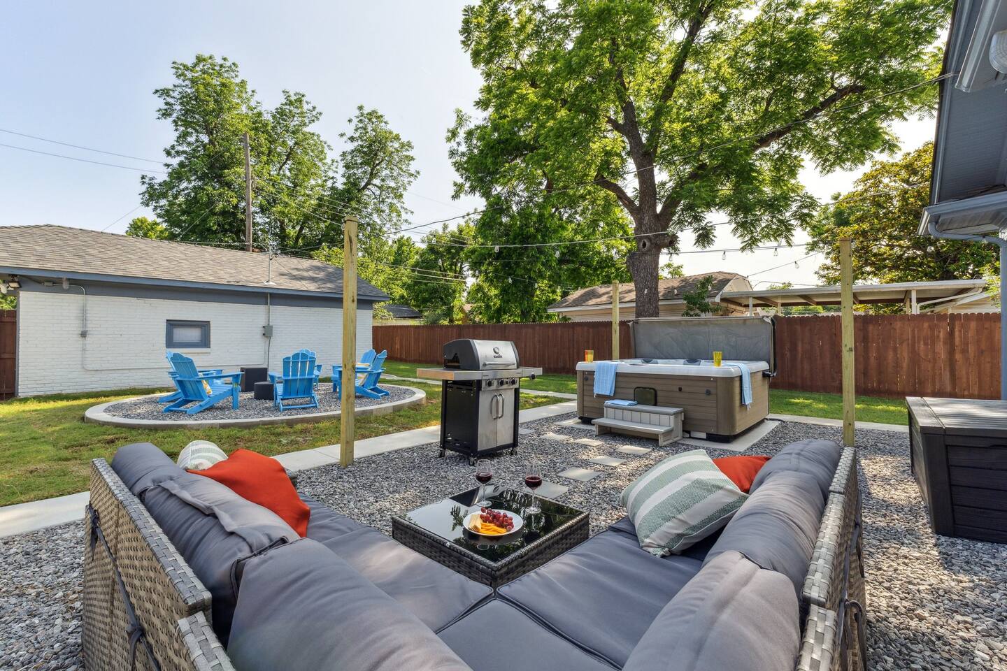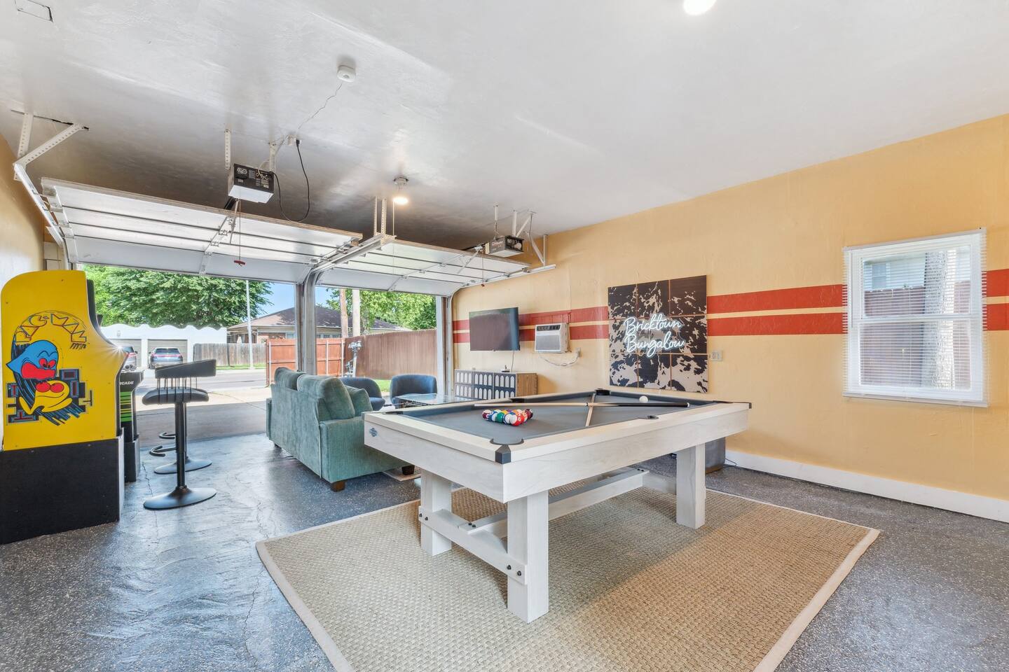 Welcome to Bricktown Bungalow — your stylish, family-friendly getaway just minutes from everything in Downtown OKC! Enjoy a relaxing hot tub, your own pickleball court, firepit, and private game lounge with arcade games, billiards, and foosball. Sleeps up to 10 with 3 spacious bedrooms (5 beds) and 2 full baths. 50 inch Roku TVs in every room. Cook with ease in the fully stocked kitchen or on the grill. Professionally designed for comfort, fun, and unforgettable memories.